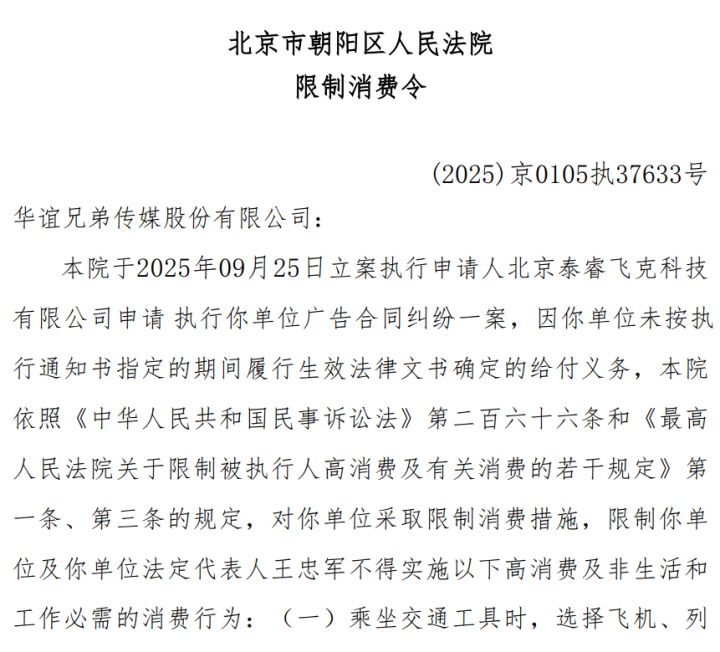 天眼查骄矜,近日,华谊昆玉传媒股份有限公司(华谊昆玉,300027.SZ)过火法定代表东谈主王忠军(王中军)新增一则法例消耗令,波及告白条约纠纷案件,苦求东谈主为北京泰睿飞克科技有限公司,推论法院为北京市晨曦区东谈主民法院。