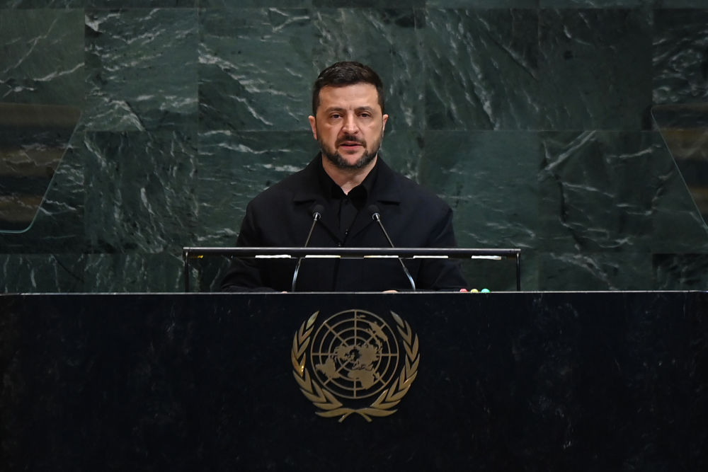 9月24日,在位于纽约的磋议国总部,乌克兰总统泽连斯基在第80届磋议国大会一般性辩说上发言。新华社记者李睿摄
