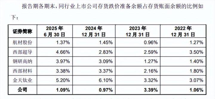 有研复材暗示,2022年、2024年及2025年6月末,公司存货跌价准备计提比例低于同业业上市公司,主要系公司居品举座定制化进度较高,以销定产、以产定采的进度更高,在手订单肃清率较高,遭遇市集波动导致存货跌价的进度较同业业上市公司小。另外,公司存货盘活率大幅高于同业业上市公司。