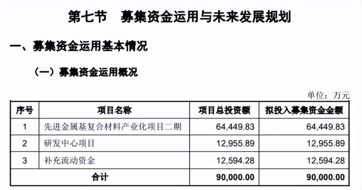 据短平快解读了解,本次IPO,有研复材拟公开刊行不逾越1.59亿股,拟召募资金9亿元,用于先进金属基复合材料产业假名目二期、研发中心名目、补充流动资金名目,拟参加召募资金诀别为6.44亿元、1.3亿元、1.26亿元。