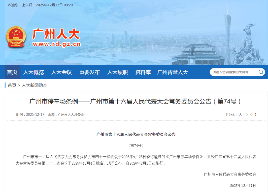 广州市十六届东说念主大常委会第四十一次会议校正通过的《广州市泊车场条例》(下称《条例》),经省十四届东说念主大常委会第二十二次会议批准,将于2026年2月1日起履行。
