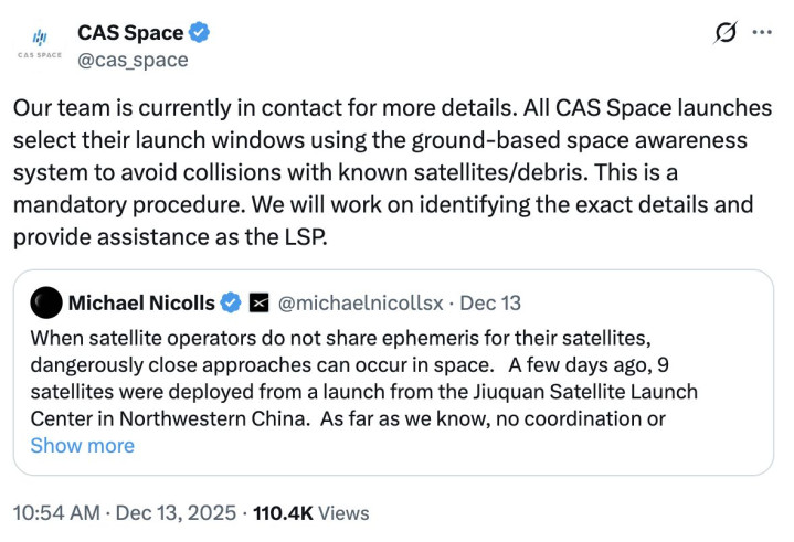 近日,SpaceX“星链”工程副总裁迈克尔·尼科尔斯在外交媒体发文,称我国近期辐射的一批卫星中,有一颗与“星链”卫星出现了200米的近距离接近的情况,并称这次辐射未与在轨开动的卫星进行调和或突破淹没。