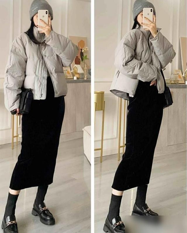 其实冬天的穿搭痛点就俩:要么冻得踉蹒跚跄耍“风姿”,要么裹得像粽子丢“温度”。但小黑裙+羽绒服刚好把这俩问题措置了——小黑裙自己是“显瘦密码”,岂论是古道、丝绒也曾带点小开叉的名目,贴肤的版型能把你的弧线“勾”出来;羽绒服选对版型(短款收腰>中长款直筒>oversize到膝盖),刚好盖住腰腹,知道裙子的下摆,一层软一层硬,档次感平直拉满。